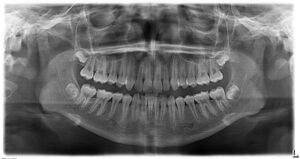 2- Panoramic : It’s a two-dimensional (2-D) dental X-ray examination that captures the entire mouth in a single image, including the teeth, upper and lower jaws, surrounding structures, and tissues.